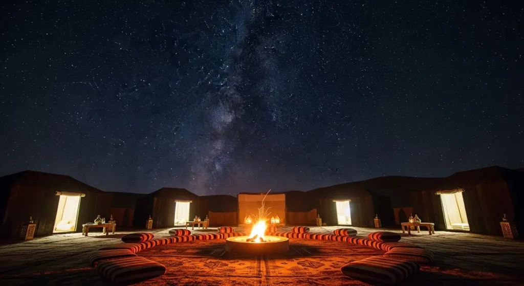 Dormir no deserto, longe de qualquer poluição luminosa, revela um céu de uma clareza assombrosa. Os acampamentos variam em estilo, desde o tradicional acampamento berbere, mais rústico e autêntico, até os acampamentos de luxo, que oferecem o conforto de banheiros privativos e camas macias sem sacrificar a magia do entorno.