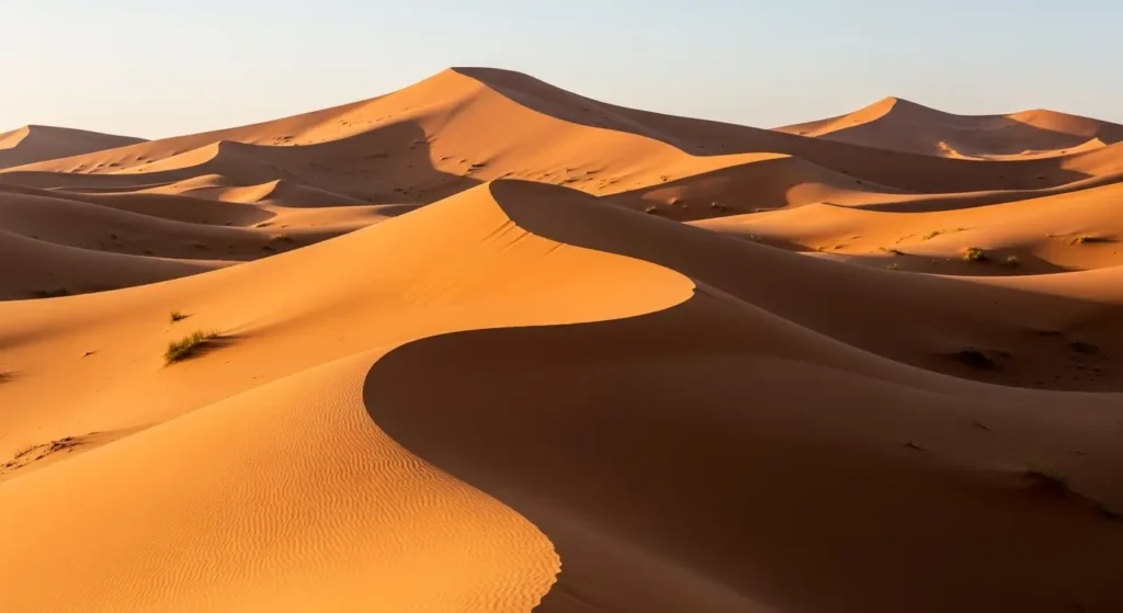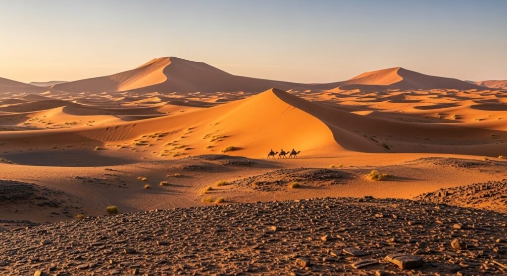 Por outro lado, as Dunas de Erg Chigaga, acessíveis via M’hamid ou Zagora, oferecem o Saara “selvagem”. A jornada para chegar lá é mais longa, exigindo um robusto 4×4 para cruzar planícies áridas antes que as dunas apareçam no horizonte.