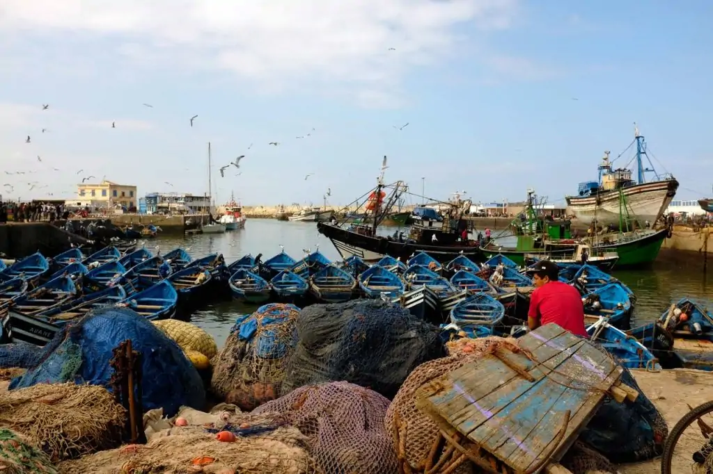 O coração vibrante de Essaouira. Observe o balé dos barcos de pesca azuis, os pescadores consertando suas redes e as gaivotas sobrevoando as bancas de peixe fresco. É uma cena autêntica e cheia de vida.